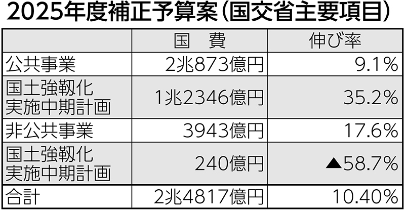 国土交通省関係の2025年度補正予算案で、公共事業費が前年度比9・1%増の2兆873億円となる...
