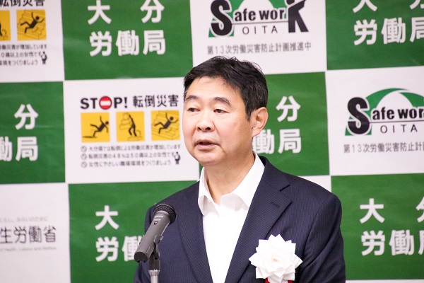 坂田善廣局長は「長期的に減少傾向だが今年は6人が亡くなられている。死亡者ゼロを目指すには地道な努力が必要だ。転倒の防止、高齢者災害の防止を重点的に模範事業所として安全衛生向上を一層目指してほしい」とあいさつ。