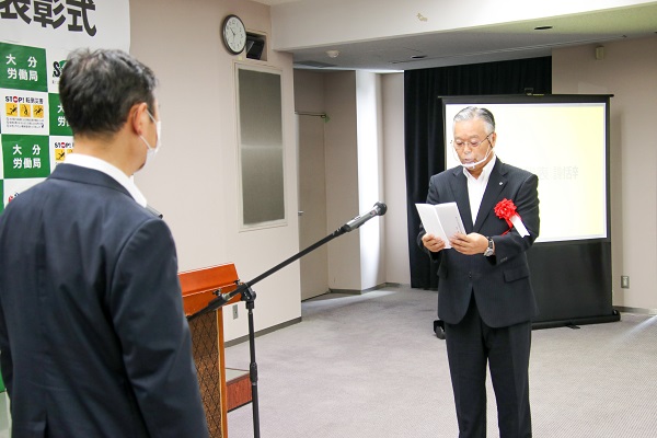 表彰の伝達、授与の後、㈱佐伯建設安全品質環境部の長尾博行参事が「今日あるのは先輩の厳しい指導で培ったたまものだ。作業者や事業者の規律徹底が労働災害減少につながると決意し、安全な職場環境をつくることを責務として一層努力したい」と謝辞を述べた。