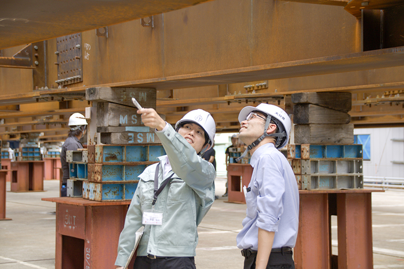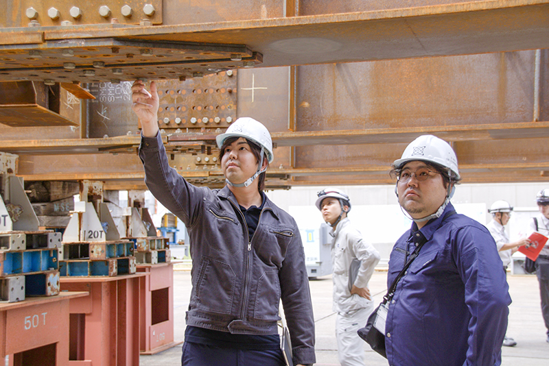 参加者は、普段なかなか見ることができない上部工製作中の写真を撮ったり、担当者から説明を熱心に聞き、「橋梁の設計業務や点検業務で生かせる知識の習得と留意点の理解など実務上で良い経験になった」と話していた。