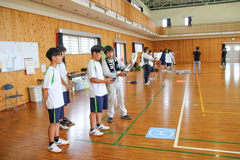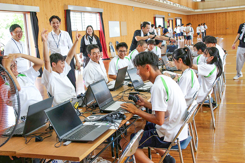 後半は体育館に移動してBUILD OITAによる体験学習。2年生11人が加わり計47人が3班に分かれ、ドローン操作や、工事現場・台風、洪水などの自然災害をVR動画で視聴したり、災害現場でクイズに答えて正解するとグッズがもらえる災害メタバースなどの体験をした。生徒らは真剣な目で操作し、クイズに正解すると歓声を上げていた。
