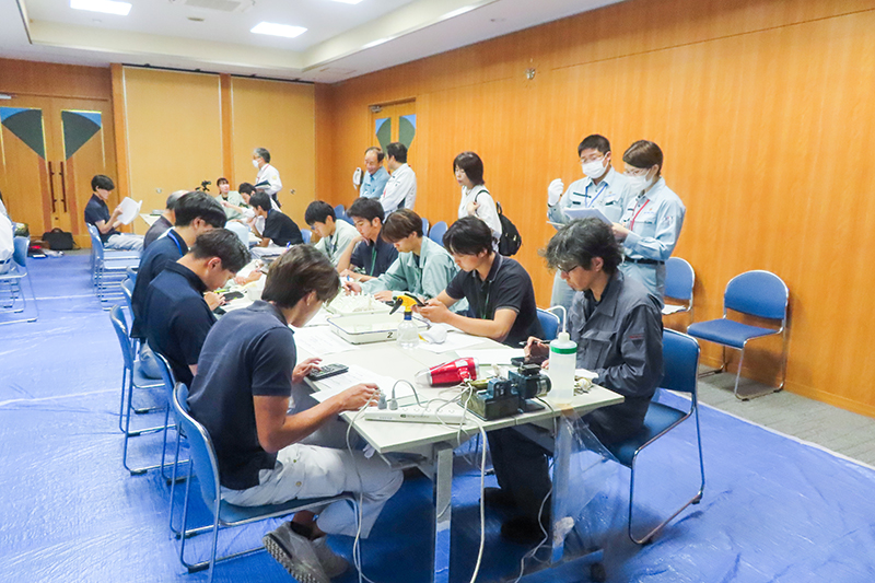 講義は室内試験2コースを含め、11月5日までに5日間全10コースを設定。10日の初日は、土の構成や分類についての講義と含水比・土粒子密度・液性限界、塑性限界の室内試験の2コースを行った。含水比試験では土に含まれる水分の比率を求めるため、土を電子レンジやフライパンで熱して水分を飛ばし重さを測るなどしていた。