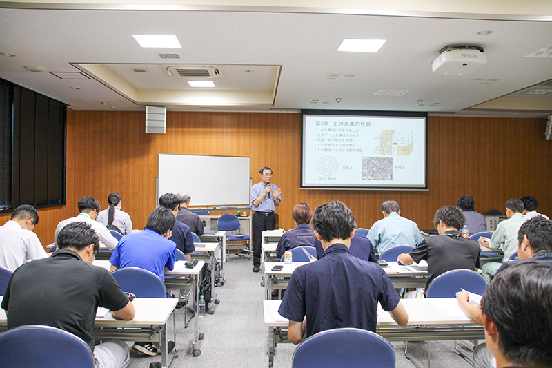 老朽化した農業用ため池の改修・整備に携わる初任技術者を対象に、ため池工事での土質力学の基礎的技術の取得と技術力向上などが目的。大坪会長が講師となり建設会社やコンサルタント会社の社員、県・市町村・土地連職員など44人が受講した。