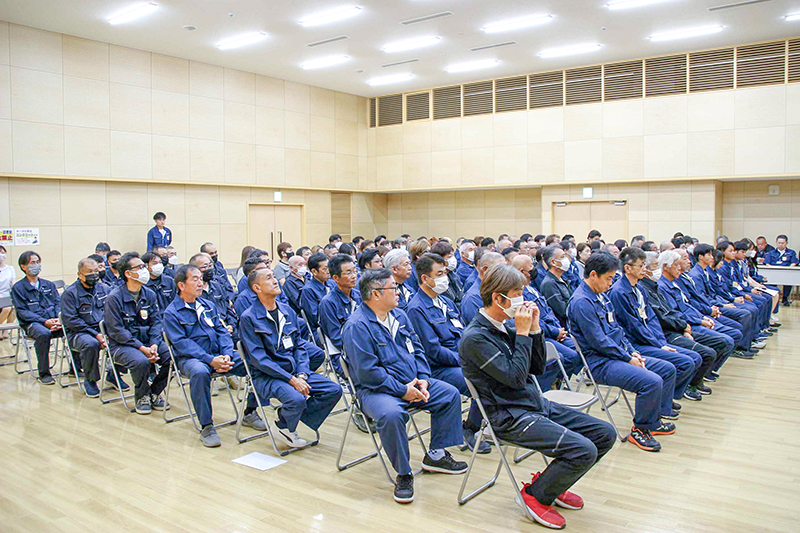 新入社員の紹介、安全表彰に続いて、三重工場から事故防止対策の報告や、同社の労働安全衛生委員会など各委員会の取り組み、今年度の活動計画などの説明があり、県交通安全教育講師の衛藤文彦さんによる交通安全講話もあった。