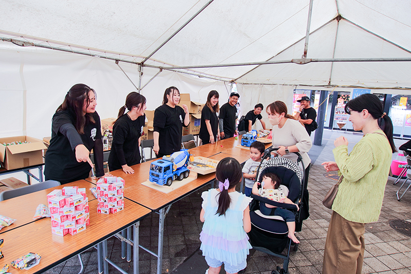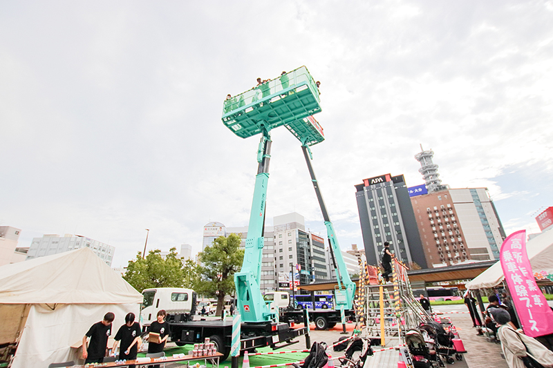 県建設業協会青年部会(柴田康輔部会長)、大分河川国道事務所(谷川征嗣所長)、県土木建築部(小野克也部長)の3者は18日、大分駅府内中央口広場で、建設業の役割や魅力を伝える「第5回土木建築フェスタ」を開いた。開場の午前10時前から多くの親子連れが列をつくり、工夫を凝らしたイベントを楽しんだ。