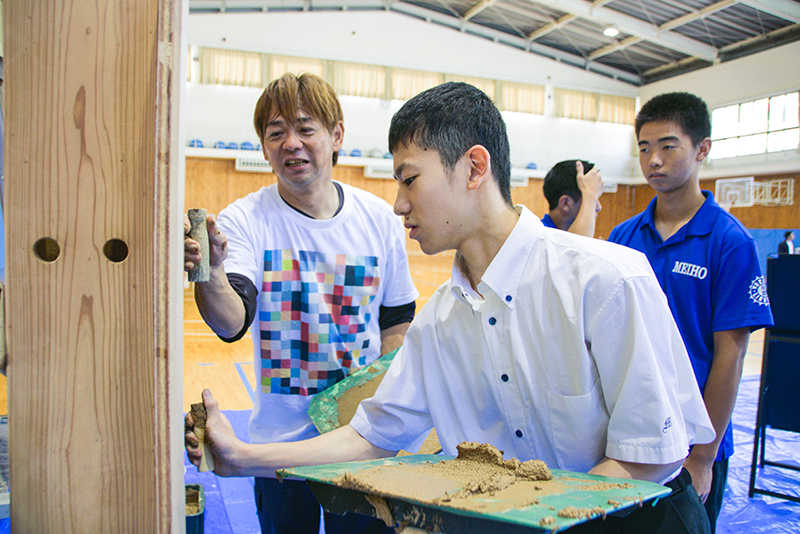 体験内容は、▽ミニ畳製作▽住宅パズル間取り作成▽住宅VR体験▽BMIで学ぶマンションづくり▽クロスやフロアタイル張り▽左官塗り体験▽シーリング工事実技▽配管工事実技▽どら焼き生地焼き体験。生徒たちは6人ずつに分かれ、このうち3職種を体験した。生徒たちは、「どの作業も難しいけどできたときはうれしかった」「VRでサザエさんの家が見れた」「ゲームみたいで簡単だった」「畳を縫うのに指先にすごく力を使った」など感想を述べた。