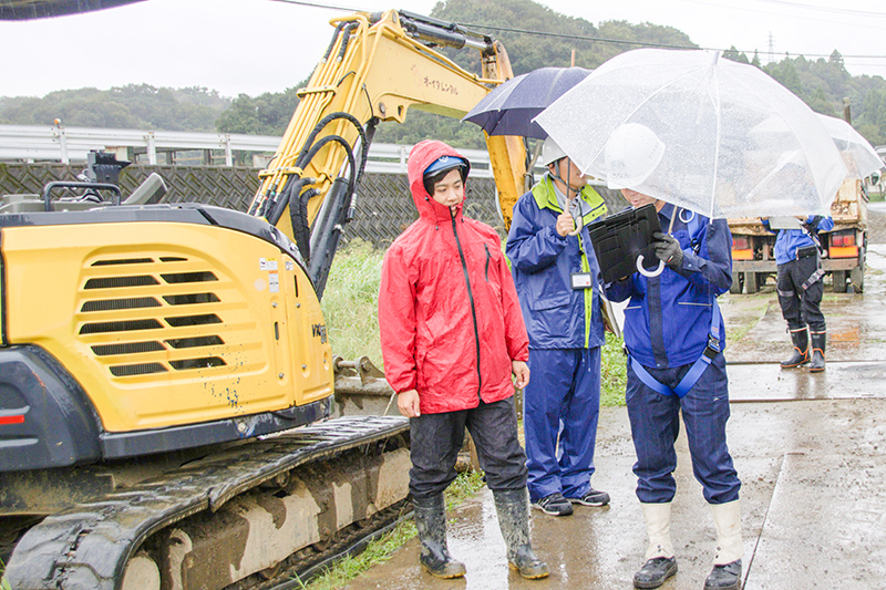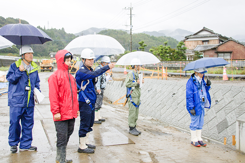 下判田の市道中判田宮ノ原線道路改築工事現場では、市の担当者から工事概要などの説明を受けた。その後、高所からの墜落防止措置の状況を中心に、掲示看板の内容や重機の管理状況、整理整頓、警備員の配置、標識による誘導状況など、安全対策を確認した。