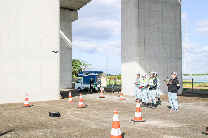 競技は①高所作業車実技②高解像度カメラ実技③ドローン撮影実技―の三つ。作業開始前ミーティングに始まり作業指示、機器操作、画像の出来映えなど一連の流れを競った。