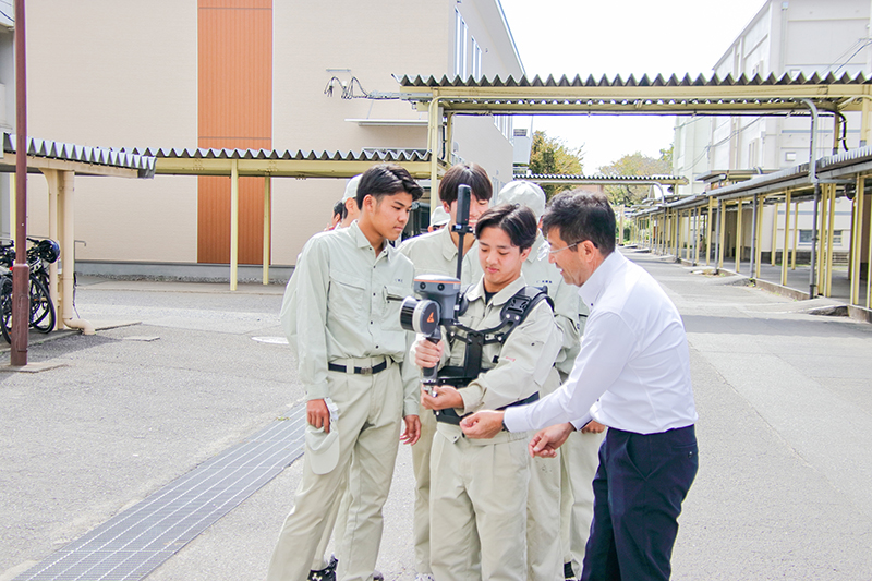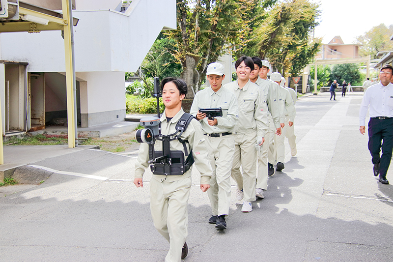 10月28日は、計測機材や設計システムを扱う㈱水上洋行(福岡市)の協力で、学校内で3次元測量を実施した。同社担当者の説明を受け、生徒が順番に測量機器を体に装着し学校敷地内を歩きながら測量した。習得データは次回の図面作製に使われる。