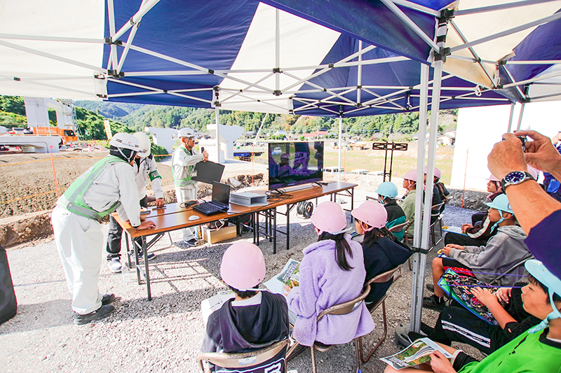 見学会では4班に分かれ▽高所作業車からの現場見学▽ドローンの操作▽バックホウの試乗▽現場担当者たちが作ったゲームで遊ぶ―を体験。施工中のボックスカルバートも見学し、大きさに圧倒されていた。