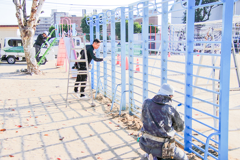 別府支部(中村年久支部長)は、組合員が石垣小学校の校庭にある遊具などを、きれいに塗り替えた。大分支部(松山雅光支部長)では、大分工業高校土木科実習室内の壁や床を、同校ラグビー部生徒13人と一緒に塗り替え。生徒たちは組合員の指導を受けながらローラーやハケを使用してペンキを塗り、きれいになった壁を見て歓声を上げていた。