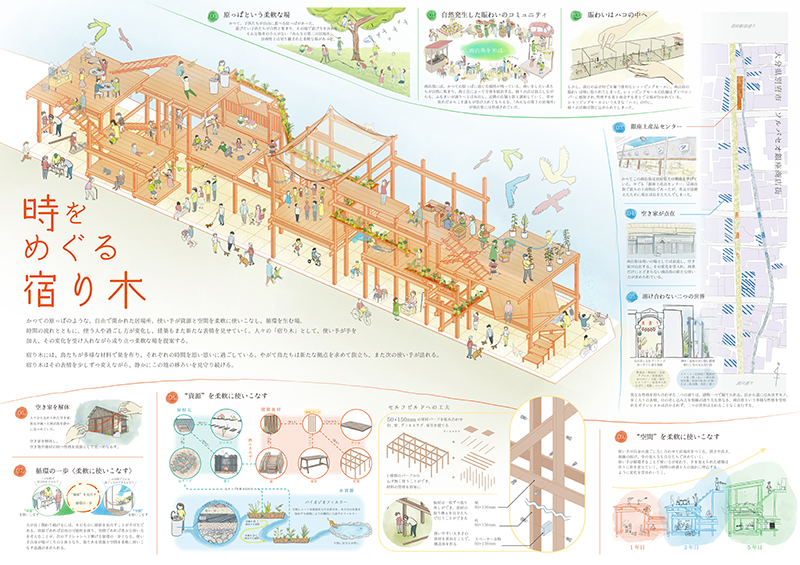 最優秀賞の藤岡さんの作品「時をめぐる宿り木」は、それぞれの場所の歴史や産業を踏まえつつ、未来への時間の中で人々の活き活きとした活動が展開されるための提案が高く評価された。
