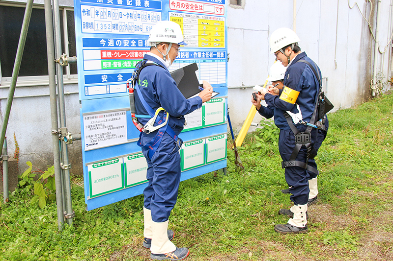 パトロールした現場は、㈱松井組が施工する延床面積521平方㍍のS造2階建てで、進捗率35%。当日の作業内容は、空調換気の配管工、各種機器の取り付けなどで、現場代理人から工事概要の説明を受け、安全対策、足場や場内の状態、各標示物の確認などを細かく点検した。