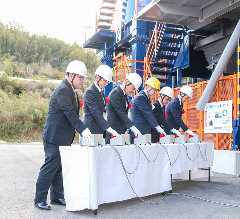 式典に先立って、神事には施主の友岡社長をはじめ施工各社の代表のほか、地元選出の県議、行政関係者、県アスファルト合材協会の佐藤高明事務局長ら25人が出席。友岡社長らが玉串をささげて新プラントの安全操業を祈願。式典で友岡社長ら6人が操業開始ボタンを押し、稼働を開始した。