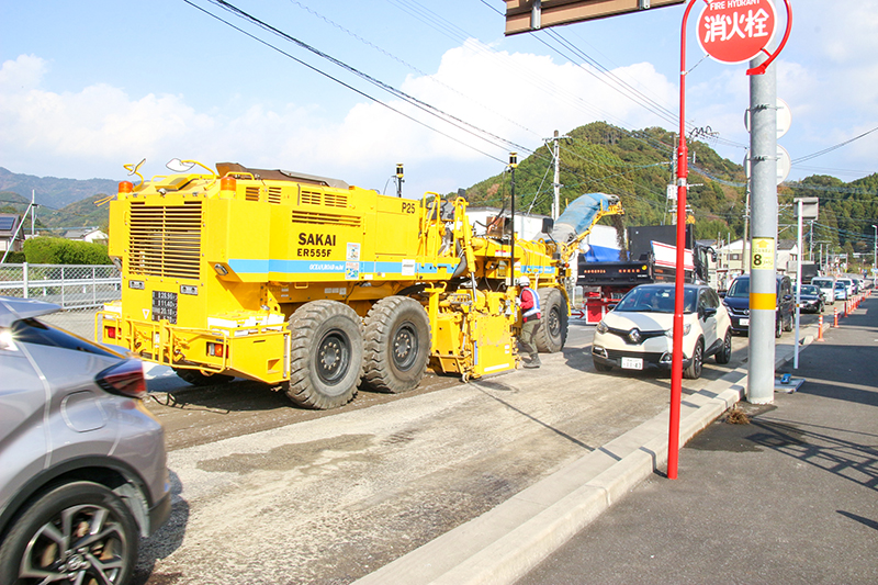 同日は、アスファルト切削厚を100㍉に、午前と午後の2回に分けて約1900平方㍍にわたって実施した。施工精度は高く、設定された切削の計画高に対し、誤差は20㍉程度だった。