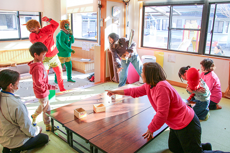 児童代表は「来てくれてありがとう。また来てください」とお礼を述べた。鬼に扮した同社経営企画本部の飯田竜太さんは「当社は市の仕事のおかげで大きくなれた。そのお返しの思いを込めて実施している。笑顔になってくれるとうれしい」と話した。