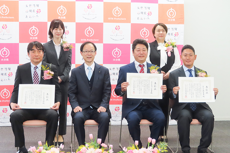 おおいた女性活躍推進事業者表彰は、建設業界から㈱高山組(高山茂明社長、竹田市)と㈱堀土木(堀秀暢社長、日田市)が、製造業から㈲ファン工業(野崎栄司社長、大分市)の3社が表彰された。