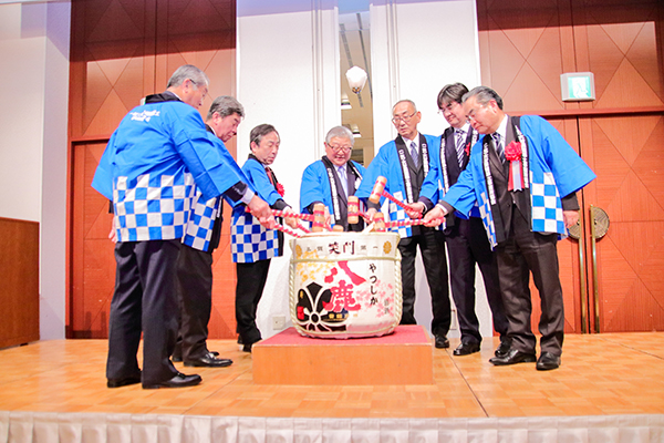 祝賀会では、仲摩会長らの鏡割り後に上野会長が乾杯の発声。宮崎県建築士事務所協会の村社俊弘会長の音頭で万歳三唱をして会を閉じた。