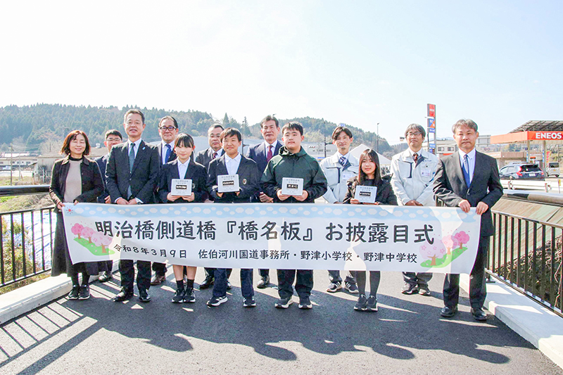 橋名板がお披露目された後、児童生徒らが橋に取り付けた。明大工業の後藤英昭現場代理人、工事部・吉野伸哉主任から児童生徒らに記念品が贈られた。