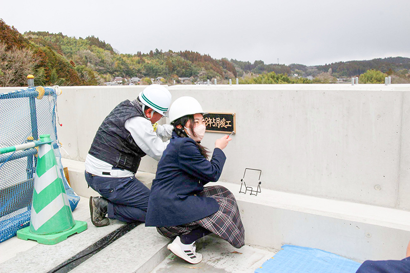 高村所長が整備の進捗について話し、「BPには三つの橋がある。道路を通った時には今日のことを思い出してほしい」とあいさつ。橋名を揮毫した生徒児童が「自分の字が残るのは恥ずかしい反面、貴重な体験になった」などとあいさつし、橋名板を取り付けた。生徒児童らには記念品が贈られ、新橋の完成を祝った。
