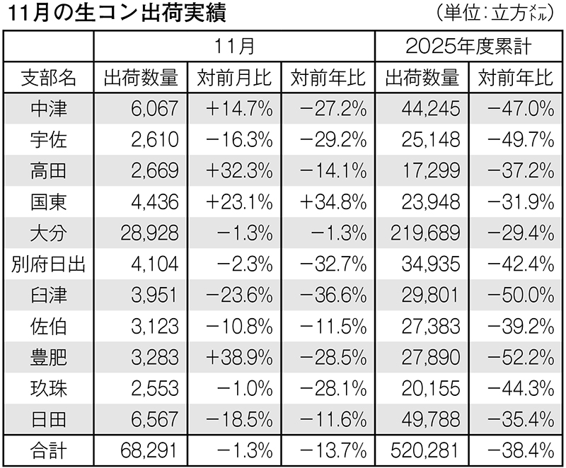 県生コンクリート工業組合が発表した2025年11月の県内生コン出荷量(員外企業を含む)は、6万...