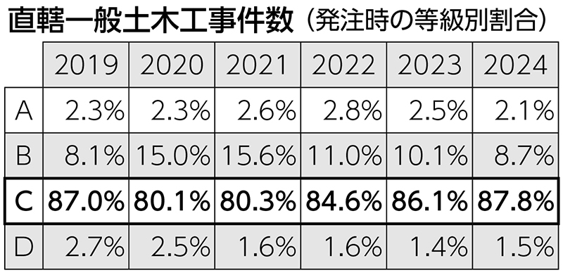 C等級の発注割合が再拡大 直轄土木の契約件数