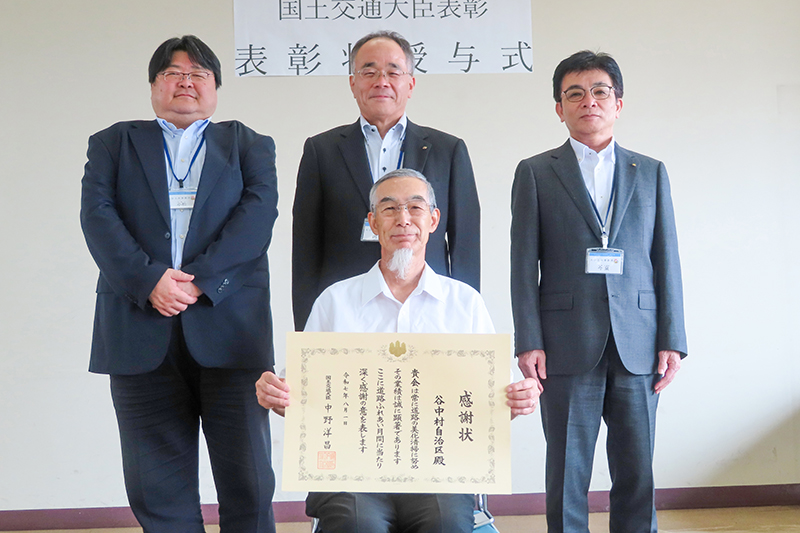 大分土木事務所の田中修所長は先に、由布市の谷中村自治区(佐藤宏区長)に「道路ふれあい月間」国土...