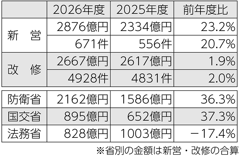 2026年度当初予算の概算要求に先立ち、中央省庁がまとめた営繕計画書に盛り込まれた工事費は前年...