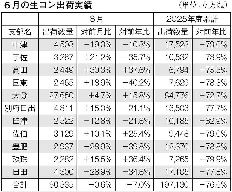 県生コンクリート工業組合が発表した2025年6月の県内生コン出荷量(員外企業含む)は、6万33...