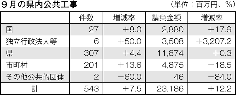 請負金額は12・2%増 9月、公共工事動向〈県内〉
