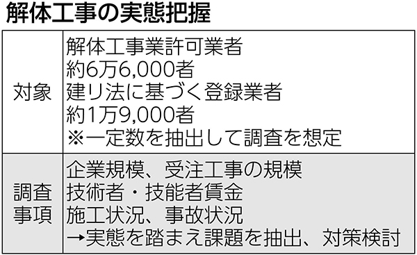 国土交通省は、公衆災害や外国人労働者を巡る社会的な不安を踏まえ、解体工事業の実態調査に乗り出す...