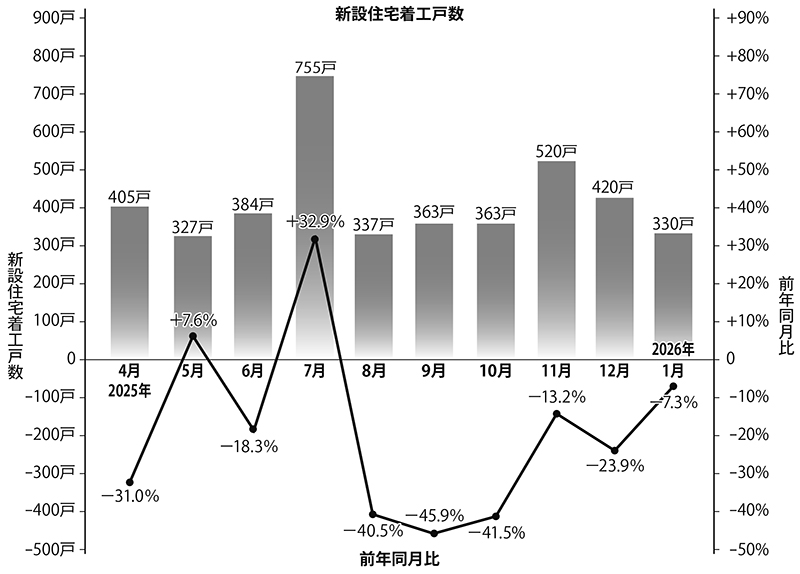 県建築住宅課は、2026年1月の建築着工統計結果を発表した。新設住宅の着工戸数は330戸で、前...