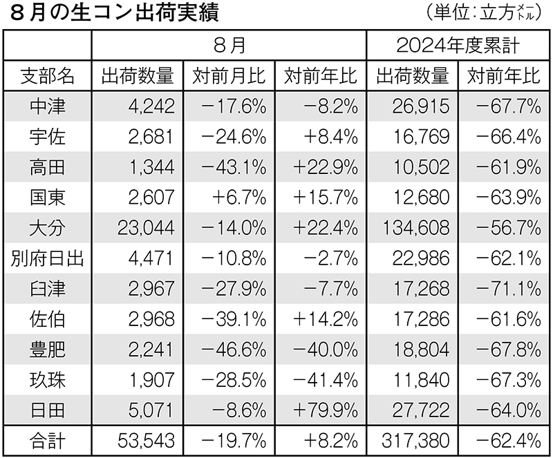 日田など6地区で増加 8月、生コン出荷量〈県内〉