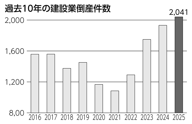 帝国データバンクがまとめた2025年度の企業倒産集計で、建設業の倒産件数が過去10年で最多の2...