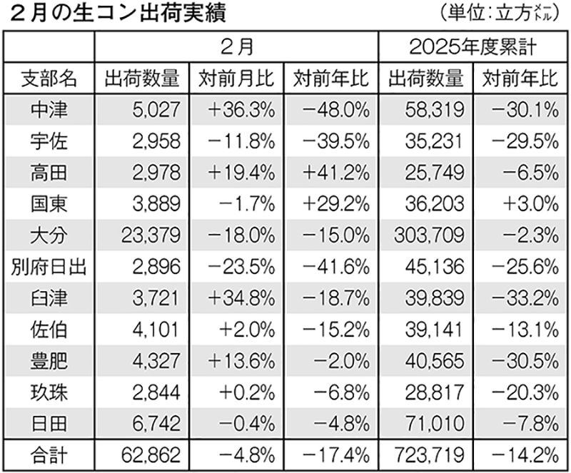 中津など9地区が減少 2月・生コン出荷量〈県内〉