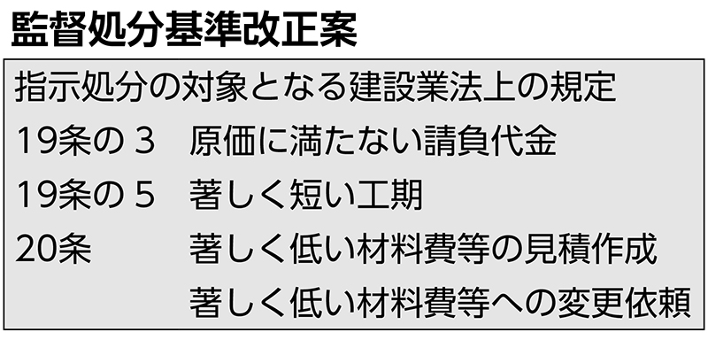 国土交通省は、改正建設業法で新たに整備された規定に違反した場合の監督処分基準案をまとめた。原価...