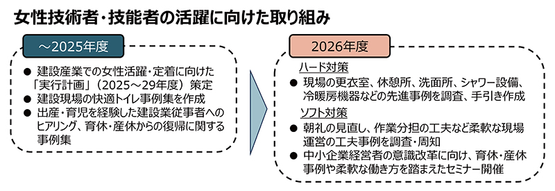国土交通省は、女性技術者・技能者の活躍と定着を促進するため、2026年度に現場環境の改善に向け...