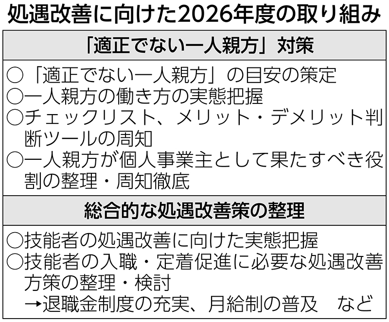 国土交通省は2026年度、技能者の入職・定着に向けた新たな方策として、月給制の普及や退職金制度...