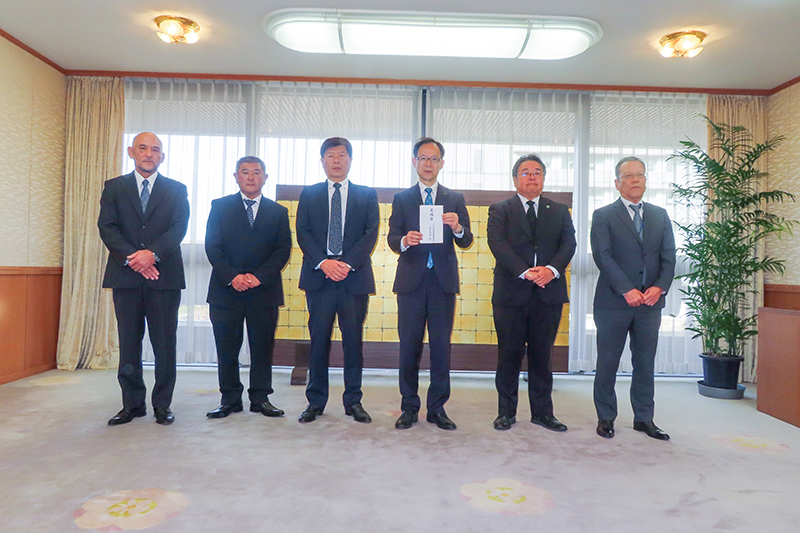 県造園建設業協会の栗木康一副会長ら5人は23日、県庁を訪れ佐藤樹一郎知事に佐賀関大規模火災被災...