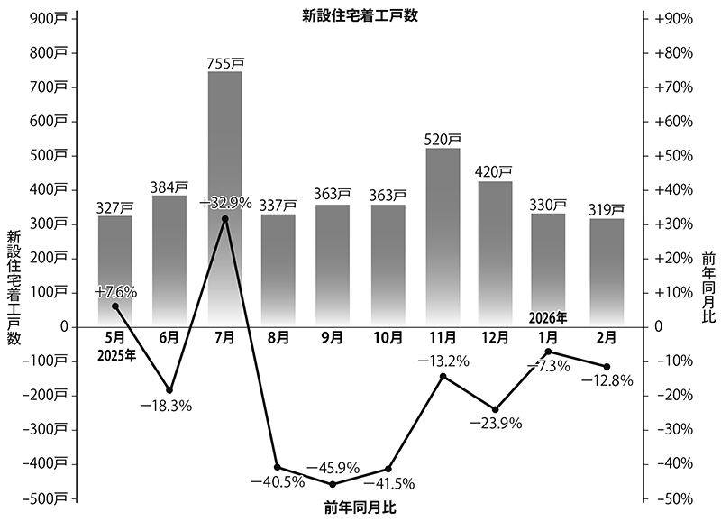 県建築住宅課は、2026年2月の建築着工統計結果を発表した。新設住宅の着工戸数は319戸で、前...