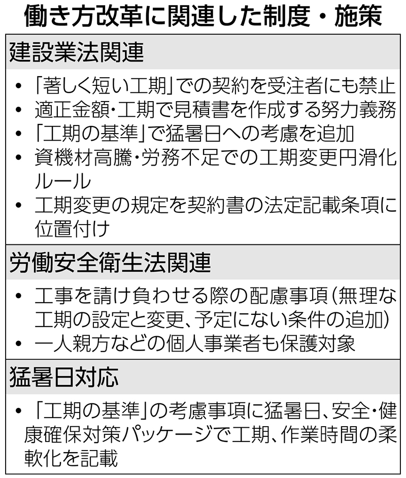 国土交通省と厚生労働省は、建設業の働き方改革に向けて、2025年末に全面施行した改正建設業法や...