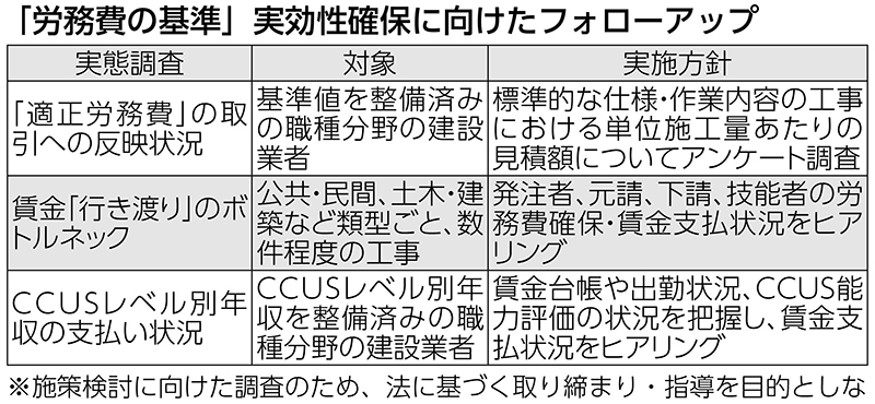 国土交通省は、改正建設業法で整備した「労務費の基準」の運用状況のフォローアップ方針を決めた。改...