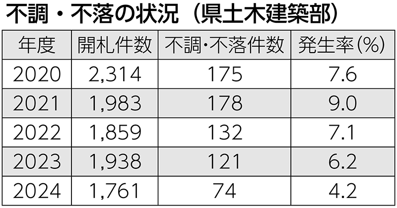 県土木建築部によると、2024年度の開札件数(随意契約含む)1761件のうち、不調・不落となっ...