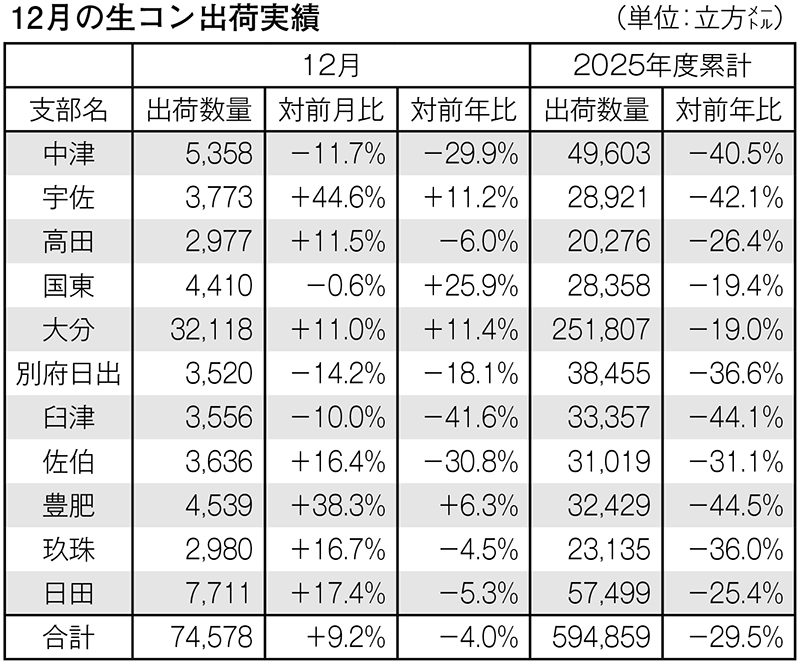 県生コンクリート工業組合が発表した2025年12月の県内生コン出荷量(員外企業を含む)は、7万...